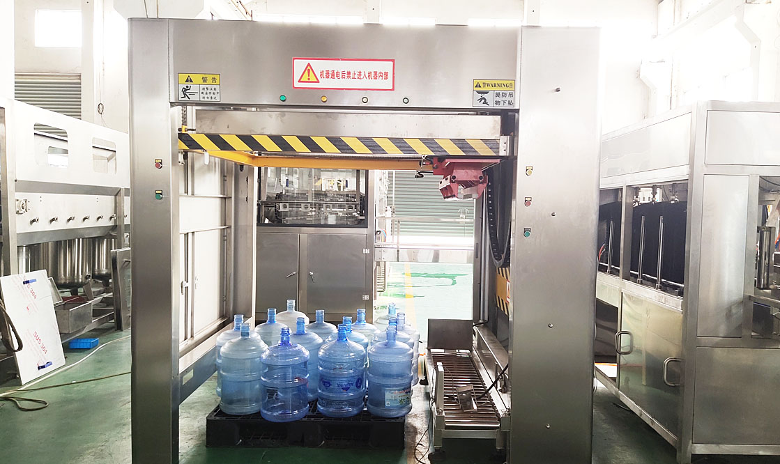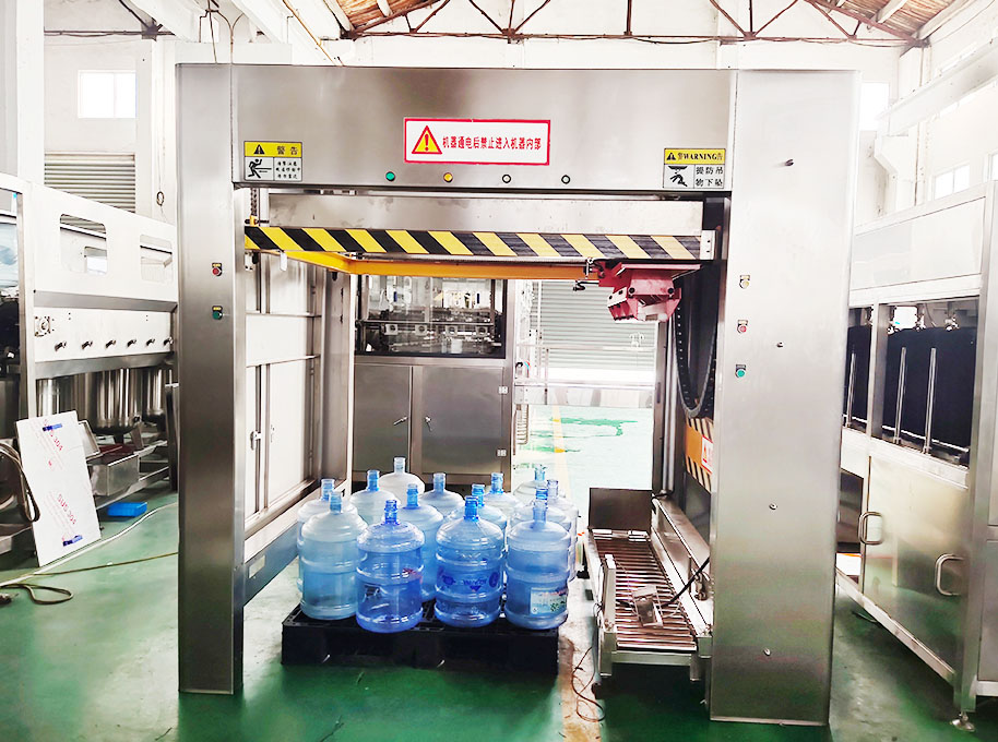 大桶水码垛机是将已罐装好的5加仑桶按一定排列码放在托盘(木质、塑胶)上,进行自动堆码,可堆码多层,然后自动输至实托工位,便于叉车运至仓库储存。