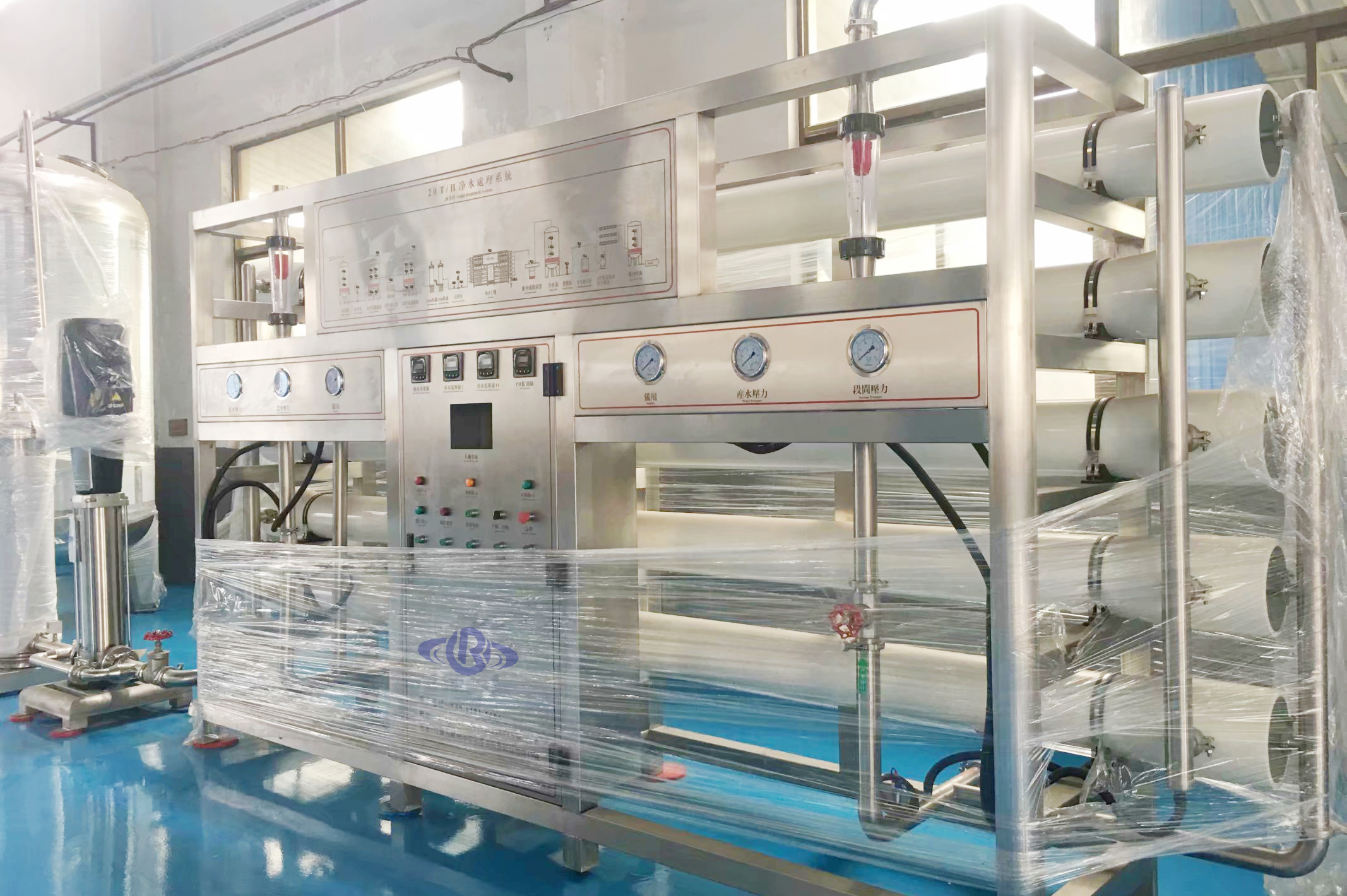 第四级预处理系统:采用5微米孔径精密过滤器使水得到进一步净化,使水的浊度和色度达到优化。保证RO系统的进水要求。纯净水设备主机系统采用反渗透技术进行脱盐处理,反渗透膜孔径仅为0.0001微米,能去除有害的可溶解性固体及细菌、病毒等 ,脱盐率达99.6%以上,生产出符合国家标准的纯净水,主机部分包含保安过滤器、高压泵和反渗透膜,保安过滤器为以上的第四级预处理系统,高压泵是主机上的核心设备之一,为反渗透膜元件提供足够的压力,以克服渗透压及运行阻力,满足装置达到额定的出水量。