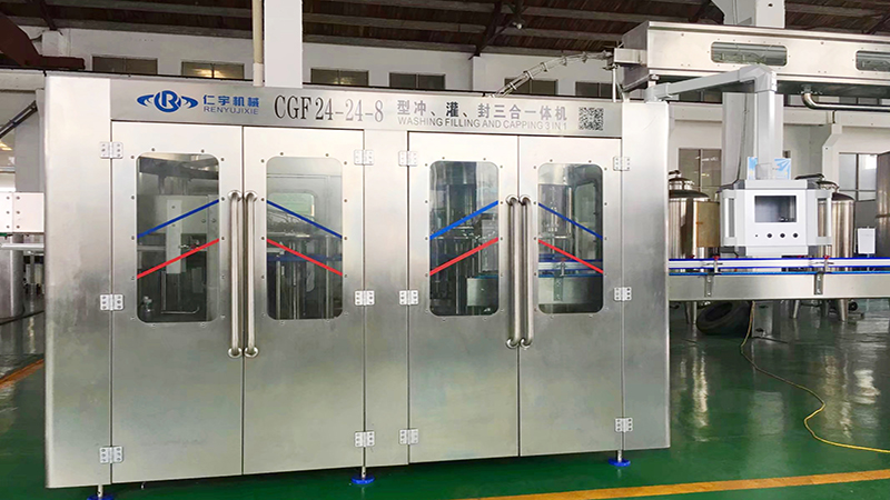 三合一饮用水灌装设备采用卡瓶颈传动技术,实现全自动冲瓶、灌装、旋盖等工序,自动化程度高。饮用水灌装生产线的大部分电气系统零件均采用国外先进产品,与液体接触的零件全部使用优质不锈钢材料,具有耐磨、稳定、故障率低等特点,产品质量处于国际先进水平。仁宇灌装机械的饮用水灌装设备适合200-1500ml的PET瓶装水的灌装生产,根据物料水位高度主动控制,过程全自动生产完成。三合一饮用水灌装机选用悬挂式灌装,不一样的瓶型、瓶子大小、厚簿都可以操作,使用范围广泛。