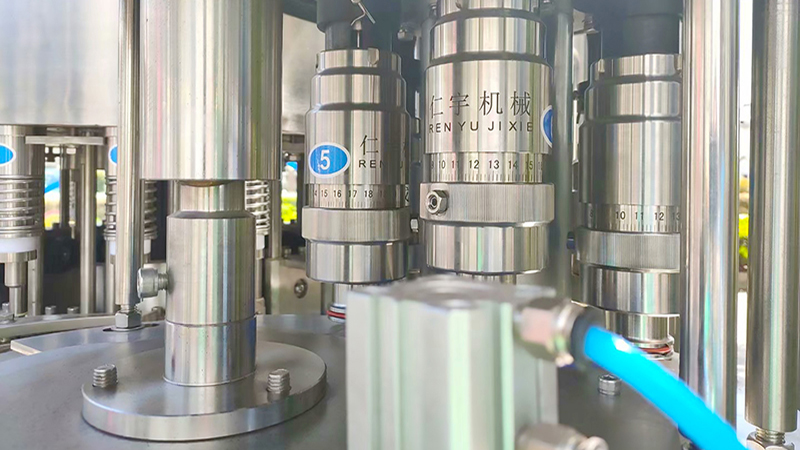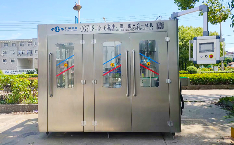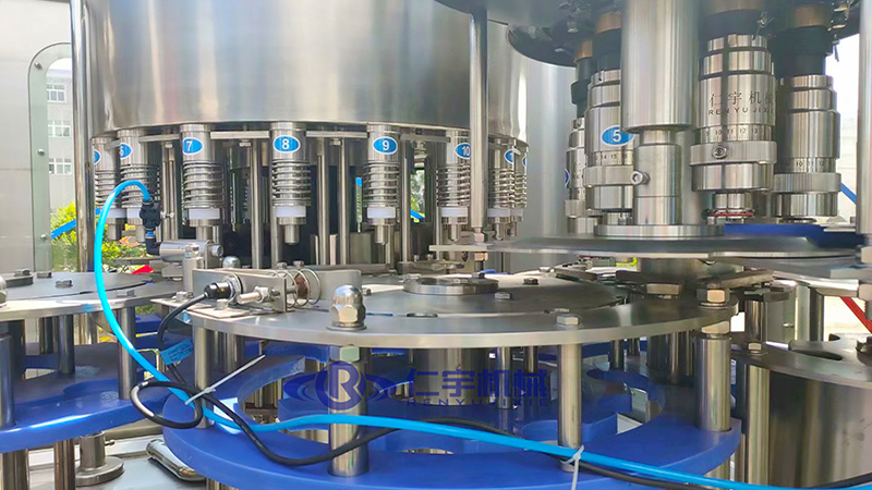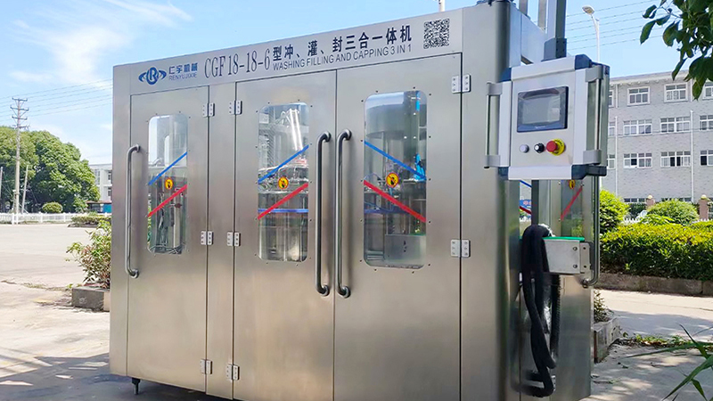 仁宇机械生产的XGF型三合一灌装机用于聚脂瓶装矿泉水、纯净水等不含气饮料的生产,在一机上实现冲瓶、灌装、封盖。产量2000-36000瓶/小时,可供用户选择。 引进日本、意大利最新技术,灌装机采用压力式定液面灌装原理,灌装速度快,液面控制稳,无滴漏现象。弹簧式冲洗钳手,空瓶随轨道自动进行180°翻转,内外二道冲洗,冲瓶效率高。采用磁力扭矩式拧盖头,实现抓盖、拧盖功能。拧盖力矩无级可调,具有恒力矩旋封塑盖功能,且不伤盖,封口严密可靠。整个灌装机采用PLC电脑程序控制及人机界面触摸屏按钮,具有料缸内液面自动控制,无瓶不灌装,无瓶不加盖等功能,采用变频器无级调速,生产能力数字显示,调整极其方便。