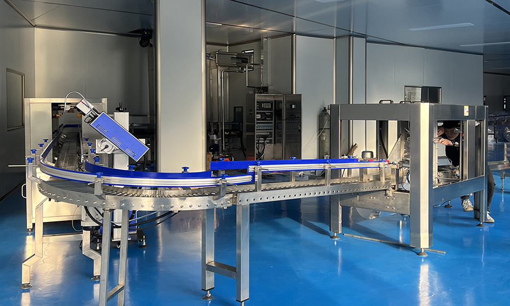 水处理系统→吹瓶机→进瓶输送→三合一灌装机(冲瓶、灌装、封口、自动上盖理盖、在线式盖消毒)→输送→灯检箱→吹干机→自动套缩标机(贴标机)→膜包机(装箱机)→码垛机→成品。