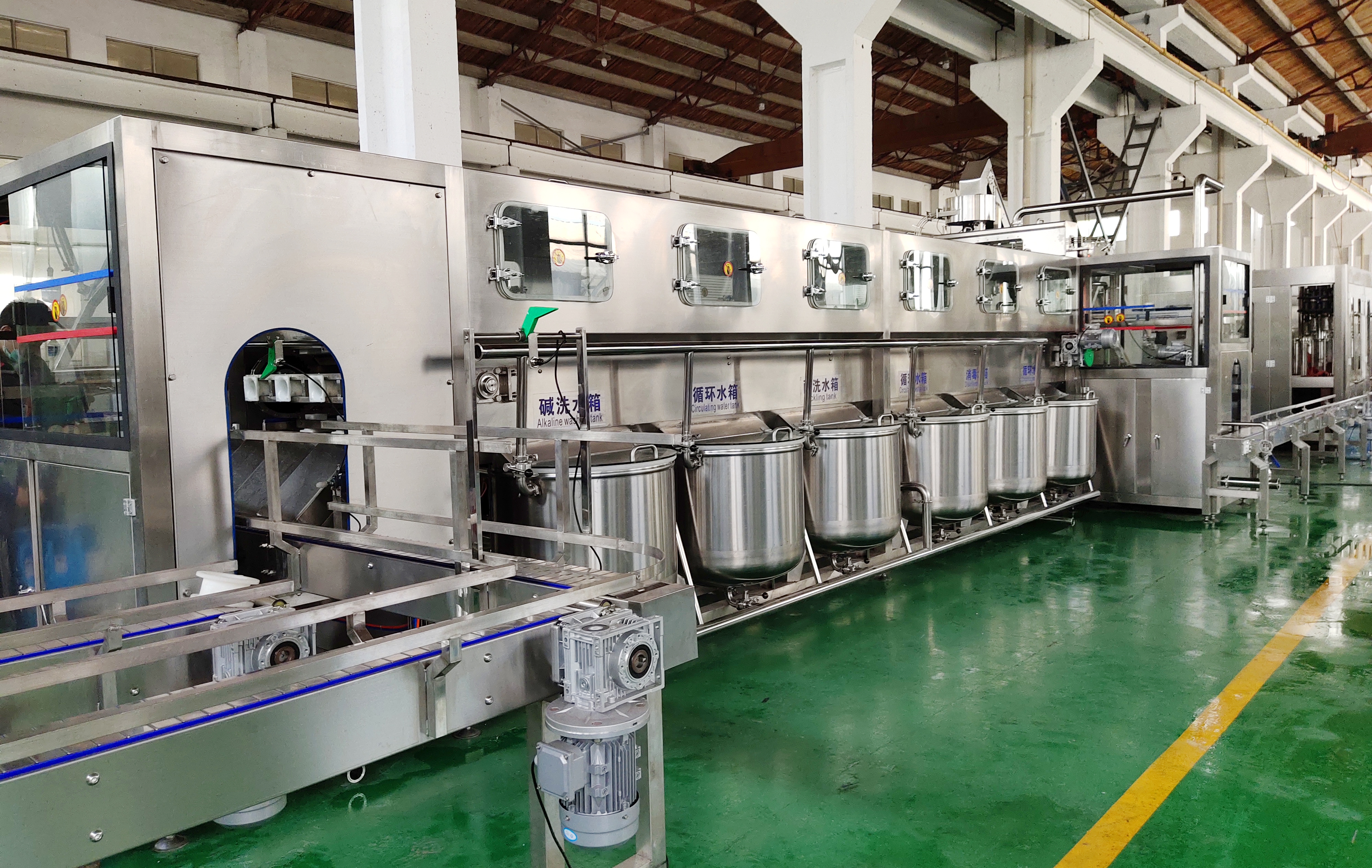 桶装水生产线设备组成:进桶输送-割标拔盖机-自动内外刷桶机(外刷内高压冲洗机)-自动上桶装置-三合一桶装水灌装机(冲洗,灌装,封口,独立电控柜)-自动上盖机-在线式桶盖消毒机-灯检设备-自动套标机-蒸汽收缩炉-打码机-自动套袋机-码垛机-成品