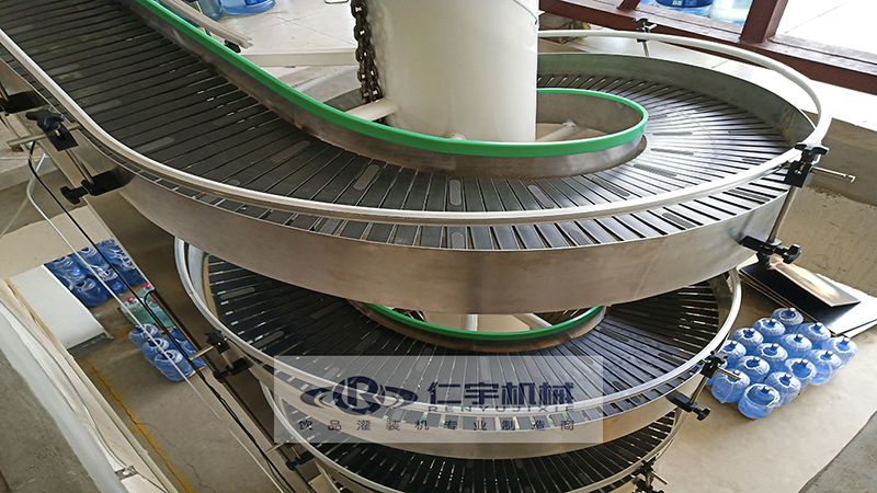 在线式桶盖消毒机:通过自动上盖机将桶盖送入理盖装置,在理盖器中设计有光电检测装置,控制上盖机的启动与停止,实现缺盖时,上盖机启动,满盖时,上盖机停止。通过理盖装置将盖子理顺,依次进入桶盖消毒机内部滑道,在风力作用下,依次向前推进,在此过程中对盖子依次进行消毒液清洗、回用水冲洗、成品水冲洗,风干后依次进入滑道,等待挂盖。相比传统的消毒方式,节省人力、自动化程度高,避免盖子与空气二次接触,有效提高桶装水产品质量。